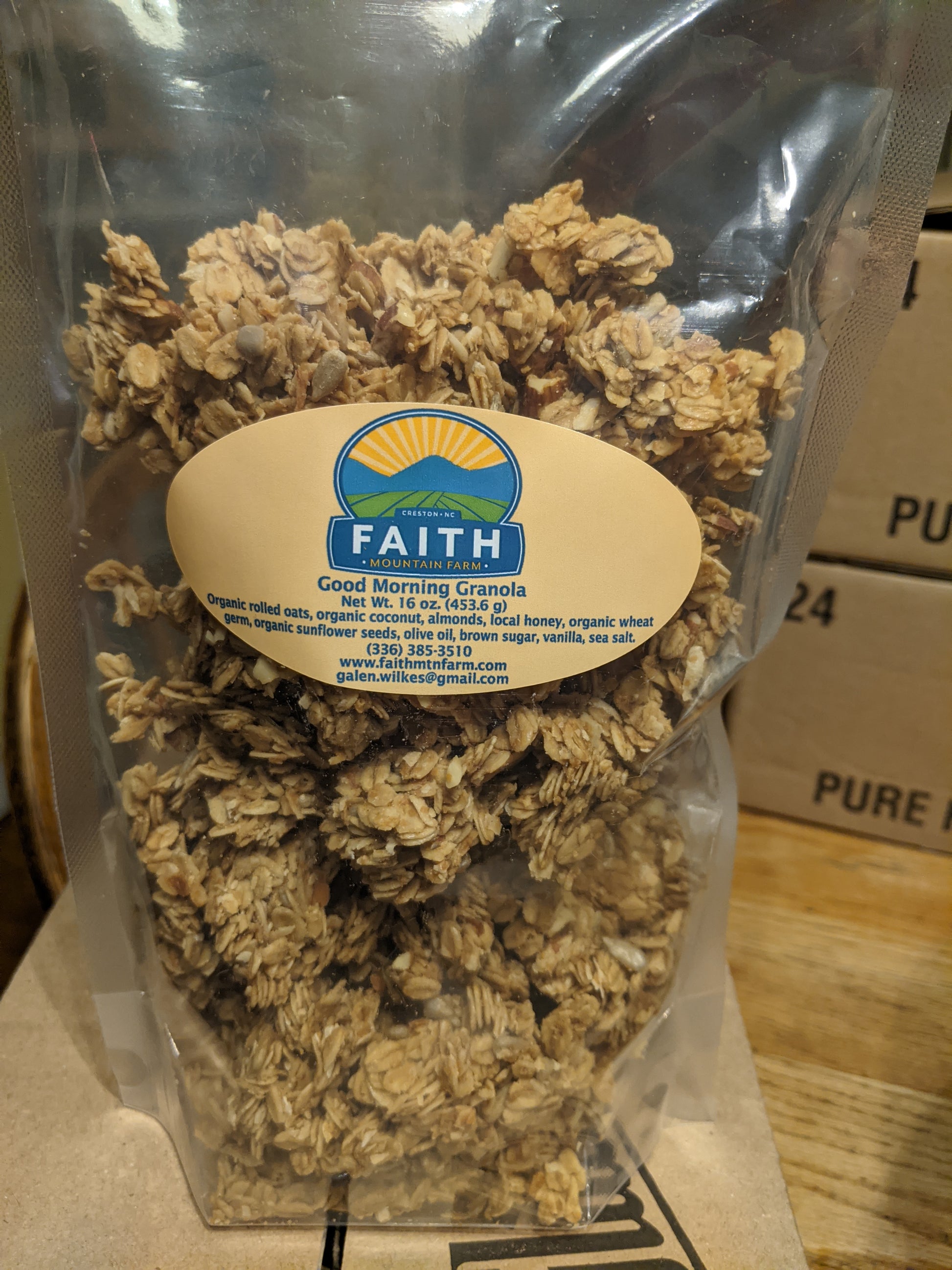 Good morning Granola, made with organic oats, local honey, and other quality ingredients. Great as cereal, in yogurt, or just as a snack! It's highly addictive, so be careful ;)